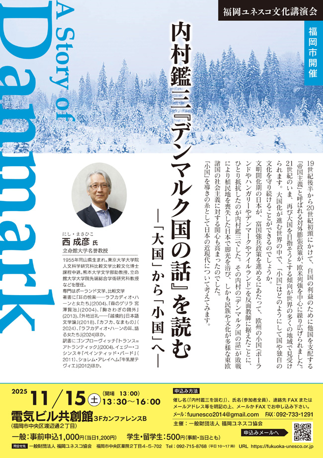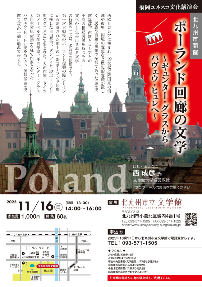 一般財団法人 福岡ユネスコ協会では、11月15日(土)、16日(日)の二日間に渡り、立命館大学名誉教授でありポーランド文学・比較文学研究者の西成彦氏をお迎えし、福岡市と北九州市で連続講演会を開催します。(福岡市開催と北九州市開催でお申し込み先が異なりますのでご注意ください。